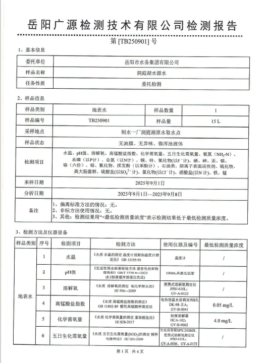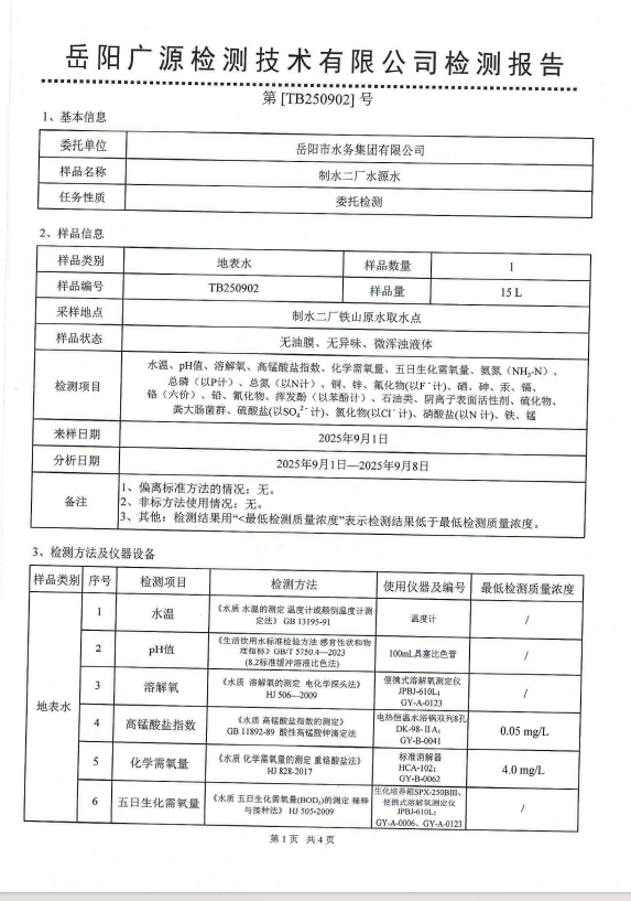 2025年9月岳阳市水务集团水源水水质检测月报表