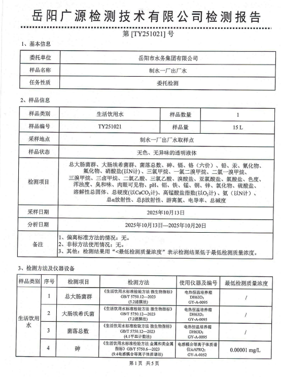 2025年10月岳阳市水务集团出厂水水质检测月报表