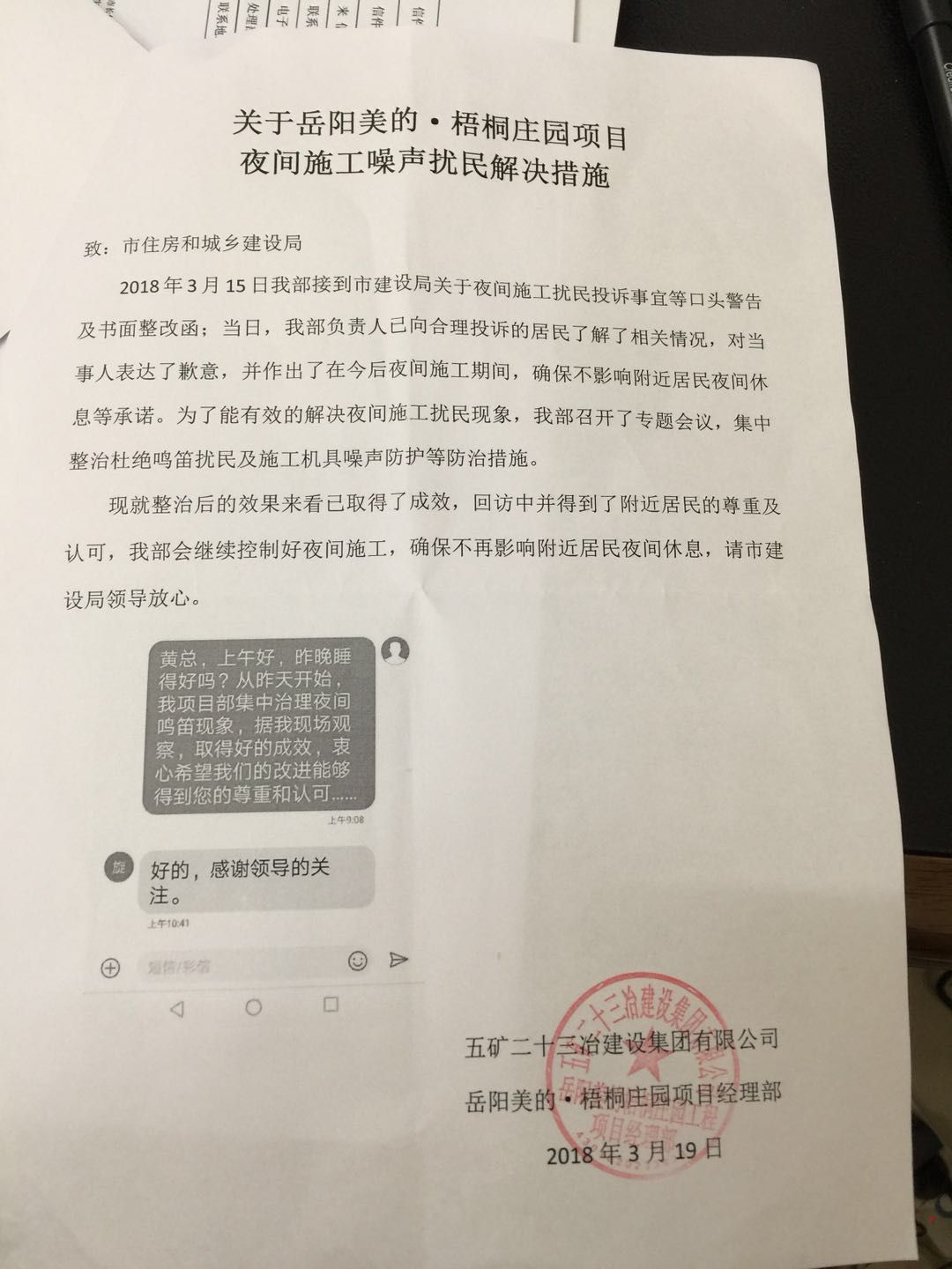| 内容: | 尊敬的领导您好: 美的梧桐庄园之前投诉过深夜施工,打混泥土问题,政府说是重点工程,让附近居民敬请谅解,可以谅解。但能不能请有关部门督促下,混泥土车晚上不要叫喇叭,凌晨一两点,喇叭声不断,一声不行接着第二声,然后按着喇叭不动,响他妈个七八秒。安静的夜里,这么刺耳的声音,很让人烦躁。还请有关部门提醒下施工单位。 |