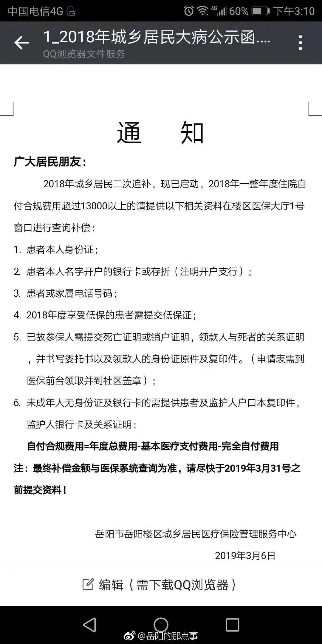 | 回复内容: | 居民所说的是城乡居民医保大病保险二次补偿政策,居民患病住院后城乡居民医保进行报销后,可进行大病保险二次补偿,补偿计算方式:年度累计住院总费用-基本医疗保险报销费用(出院结算医保报销部分)-全自付部分(湖南省医保报销三个目录外内容,医保不予报销部分)-起付线(普通居民13000元,贫困人口6500元)=自付合规费用(医保报销目录内内容,医保报销剩余部分)。 岳阳楼区人社局 2019年3月14日 |