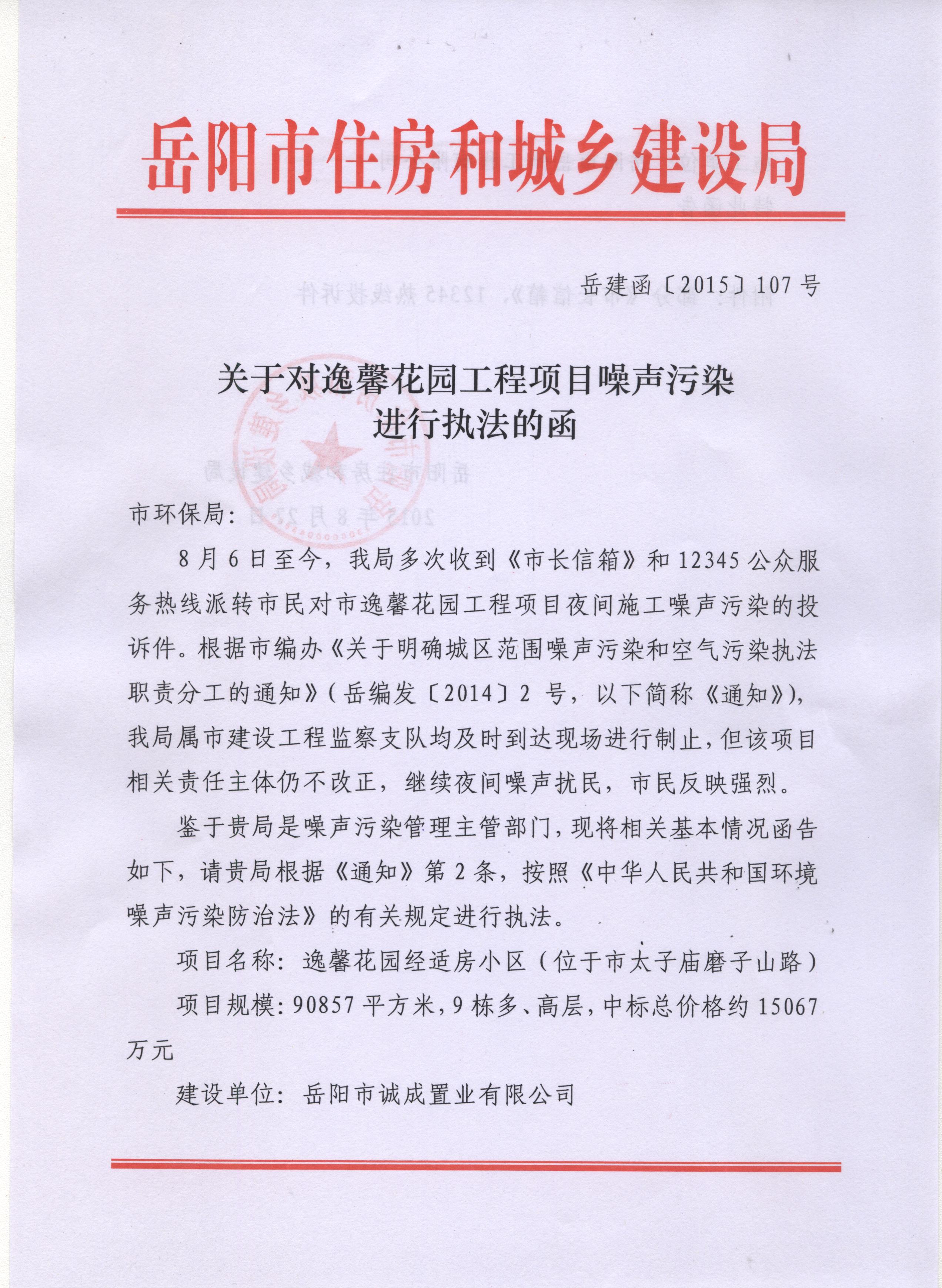 | 回复内容: | “嬷嬷小生”同志: 您好!关于逸馨花园项目噪声扰民的问题,我局根据市编办《关于明确城区范围噪声污染和空气污染执法职责分工的通知》(岳编办发[2014]2号)文件要求,向市环保局送达《关于对逸馨花园工程项目噪声污染进行执法的函》(岳建函[2015]107号),具体内容详见附件(扫描件)。 特此回复。 岳阳市住房和城乡建设局 2015年8月27日