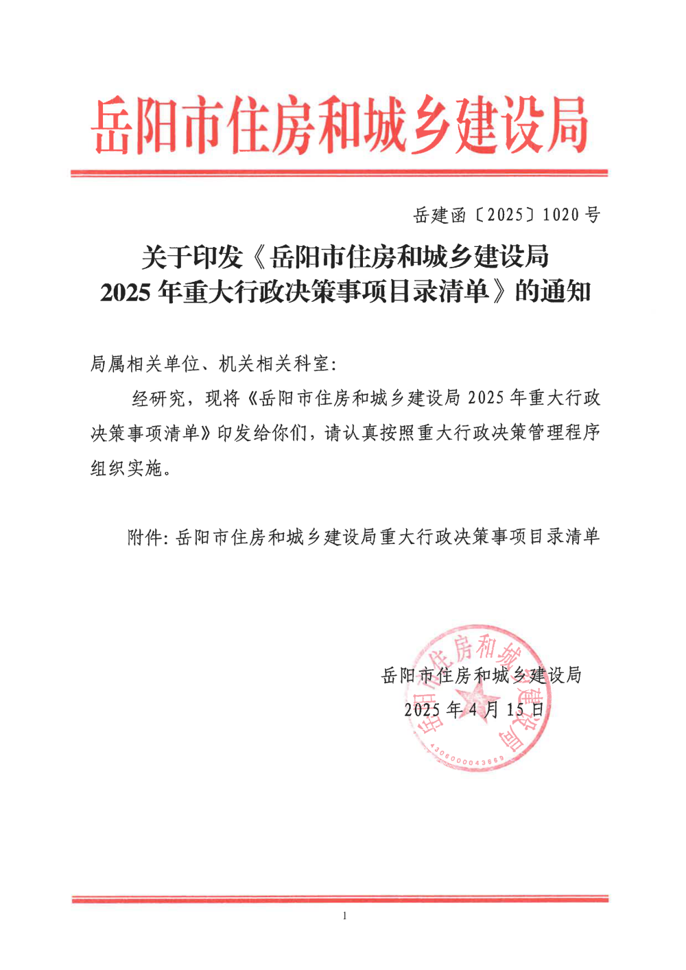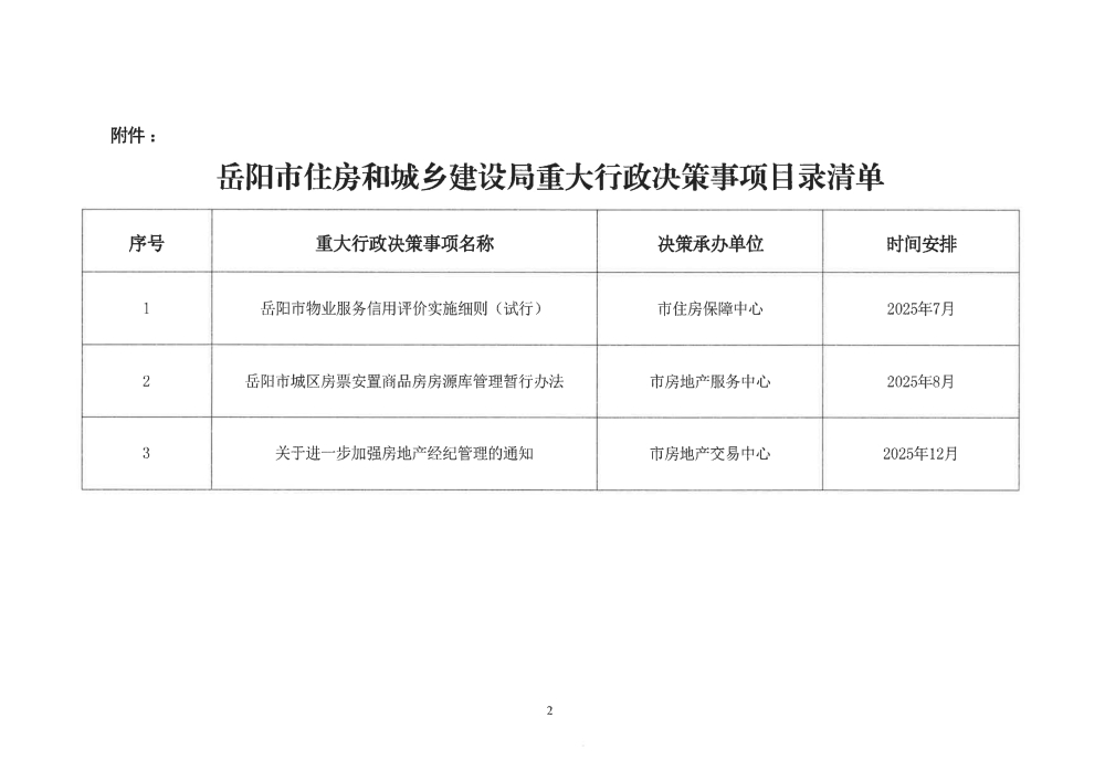 关于印发《岳阳市住房和城乡建设局2025年重大行政决策事项目录清单》的通知